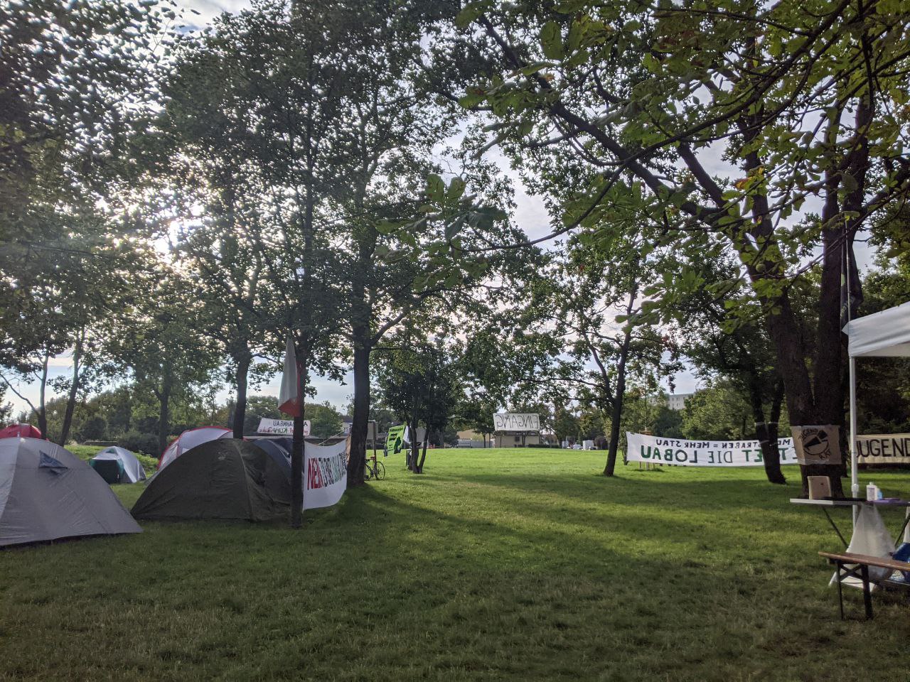 Seit 27.08. campen und besetzen wir nun gemeinsam mit dem Jugendrat, System Change Not Climate Change und Extinction Rebellion sowie lokalen Bürger*innen-Initiativen (Hirschstetten retten, Rettet die Lobau) für zukunftsfähige Mobilität und den Stopp fossiler Autobahnprojekte. Bisher war das für uns eine ereignisreiche Zeit. Am Freitag, 27.08.2021, startete das Camp spätnachmittags mit einer Demo von der U2 Hausfeldstraße zum Park in der Anfanggasse. Dort schlugen wir unsere Zelte auf und befestigten an dem ein oder anderen Baum eine Hängematte und bunte Banner. Davor wurden schon fleißig Küchenzelt, ÖKlos und Pavillions aufgestellt.
