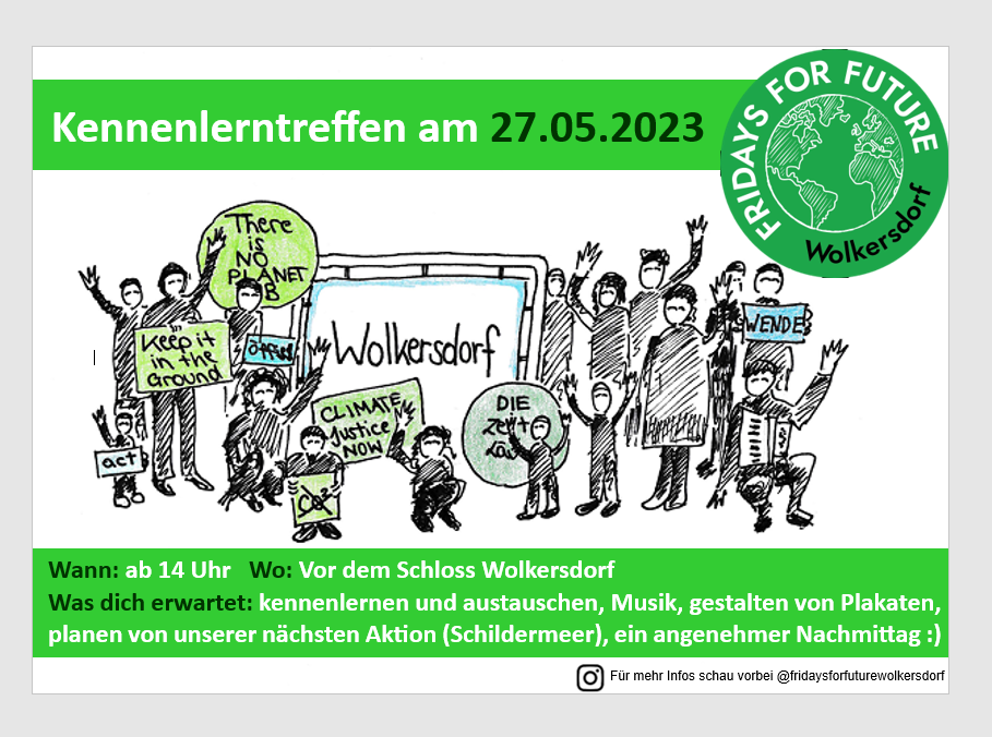 wir laden euch alle sehr herzlich zu unserem Kennenlerntreffen am 27.05.2023 ein. Wir treffen uns ab 14 Uhr vor dem Schloss Wolkersdorf. Dort werden wir gemeinsam Plakate und Banner gestalten, Lieder singen und unser nächste Aktion ein Schildermeer in Wolkersdorf planen. Wir freuen uns auf dein Kommen, Fridays for future Wolkersdorf🌍