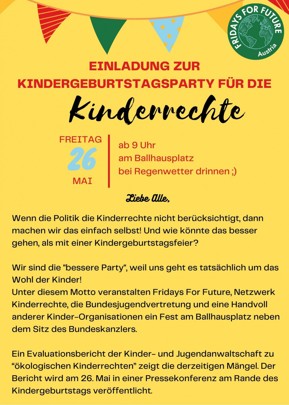 Unter diesem Motto veranstalten Fridays For Future, Netzwerk Kinderrechte, die Bundesjugendvertretung und eine Handvoll anderer Kinder-Organisationen ein Fest am Ballhausplatz neben dem Sitz des Bundeskanzlers.