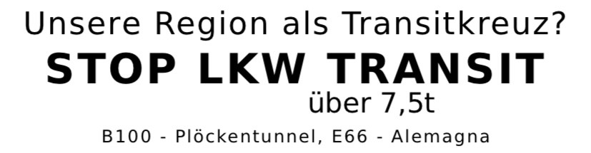 Am kommenden Freitag, 30.10. werden wir wiederum eine Kundgebung durchführen. Unser Ziel ist es, auf die Belastungen durch den Verkehr für Bevölkerung, Klima und Umwelt hinzuweisen. Ein Teil davon, der LKW-Transit, steigt spürbar. Ein erstes Ziel ist daher, ein Transit-Verbot für LKW über 7,5 Tonnen an der B100 zu forcieren. Dadurch sollen Lärm, weitere Emissionen und auch der Druck zum weiteren Ausbau von Straßen verringert werden. Für ähnliche Straßen wie z.B. der B320 (E651) im Ennstal wurde ein solches Verbot bereits erfolgreich umgesetzt.