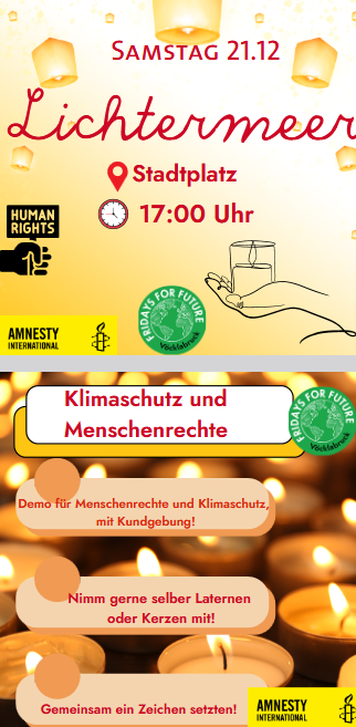 Lichtermeer am 21 Dezember um 17:00Uhr. Treffpunkt ist am Satdtplatz in Vöcklabruck. Kurzer Demozug mit anschließender Kundgebung. Gemeinsam mit Amnesty Youth Vöcklabruck veranstalten wir das Lichtermeer zu Hoffnung in schweren Zeiten.