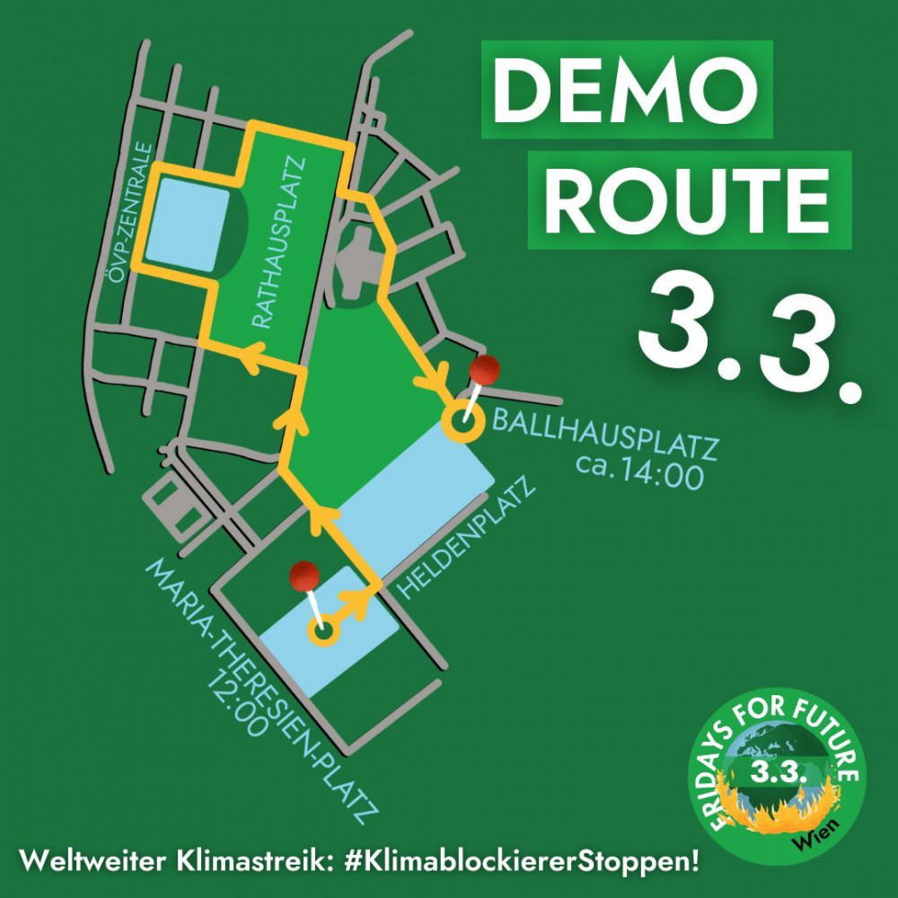 Demozug: ab 12:30 über Ring, Rathausplatz zur ÖVP-Zentrale in der Lichtenfelsgasse, anschließend werden durch Felderstraße, Rathausplatz und Löwelstraße ziehen