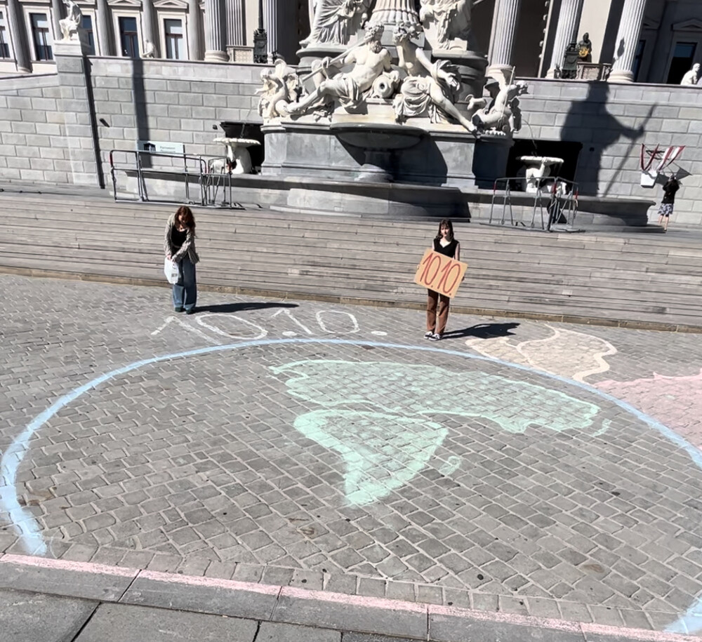 Rote Linie für Klimaschutz weltweit - Kreidebild vor Parlament: FFF in Österreich am 10.10. auf der Straßen