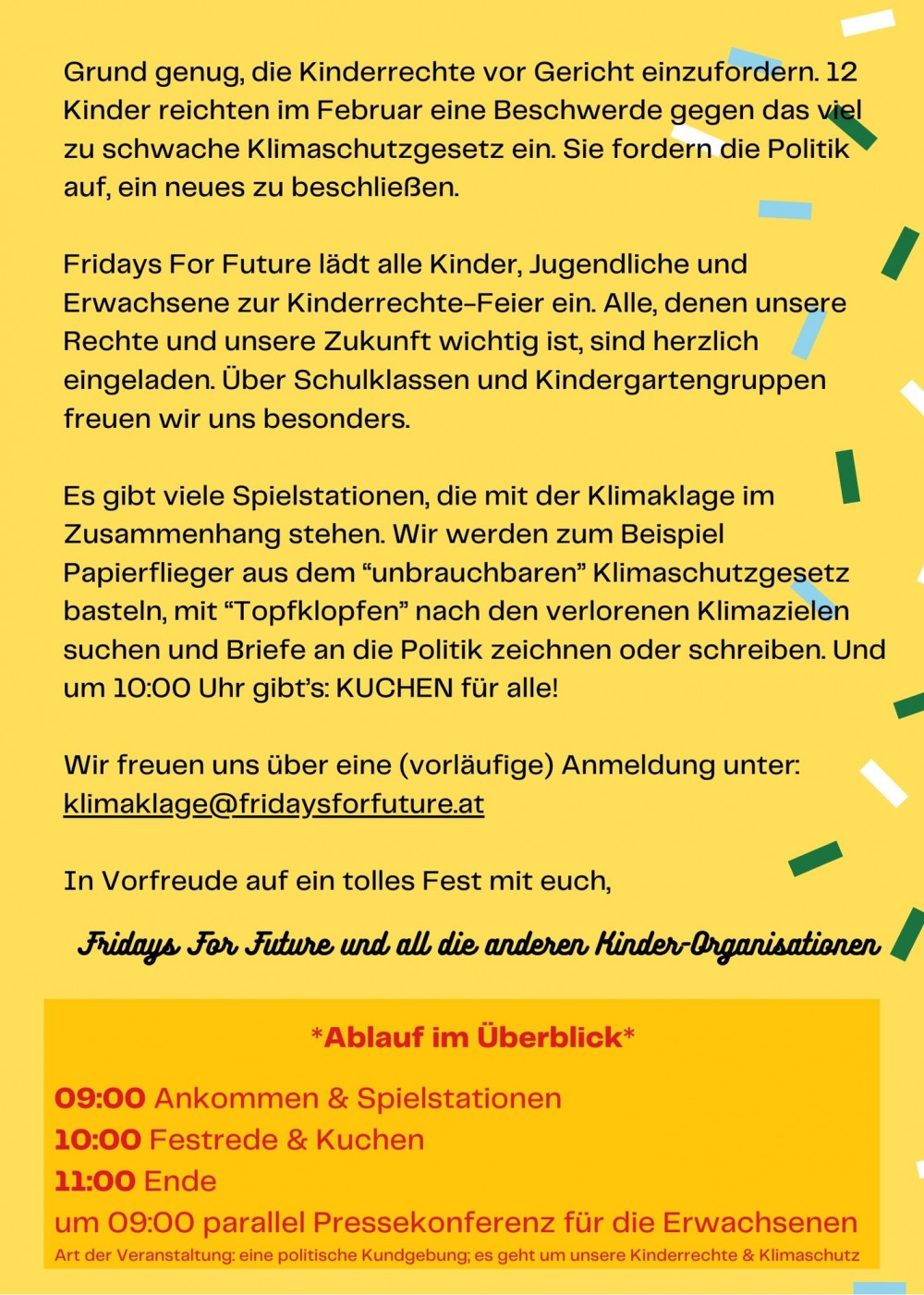 Unter diesem Motto veranstalten Fridays For Future, Netzwerk Kinderrechte, die Bundesjugendvertretung und eine Handvoll anderer Kinder-Organisationen ein Fest am Ballhausplatz neben dem Sitz des Bundeskanzlers.