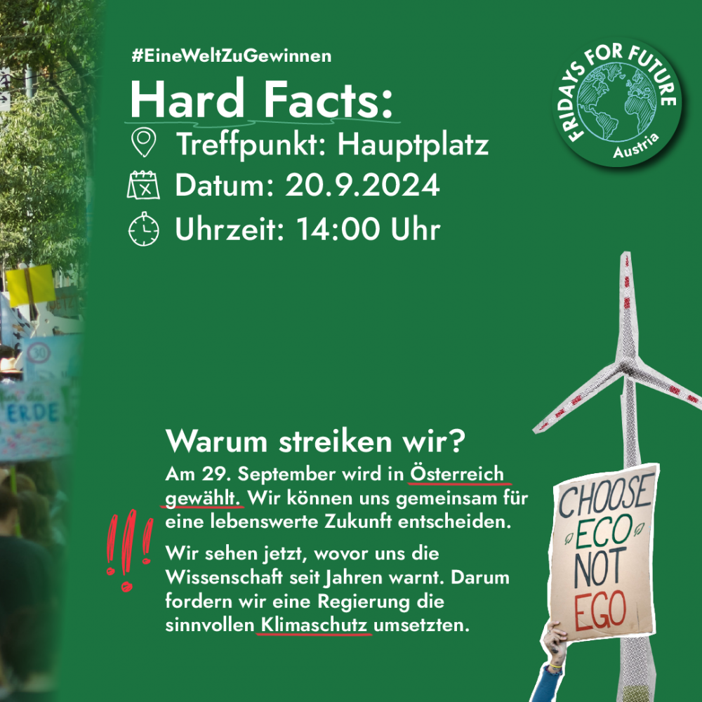 Möchtest du uns helfen die Info weiterzutragen? Benutze diesen Link auf deiner Website: https://fridaysforfuture.at/events/weltweiter-klimastreik-20-09-24